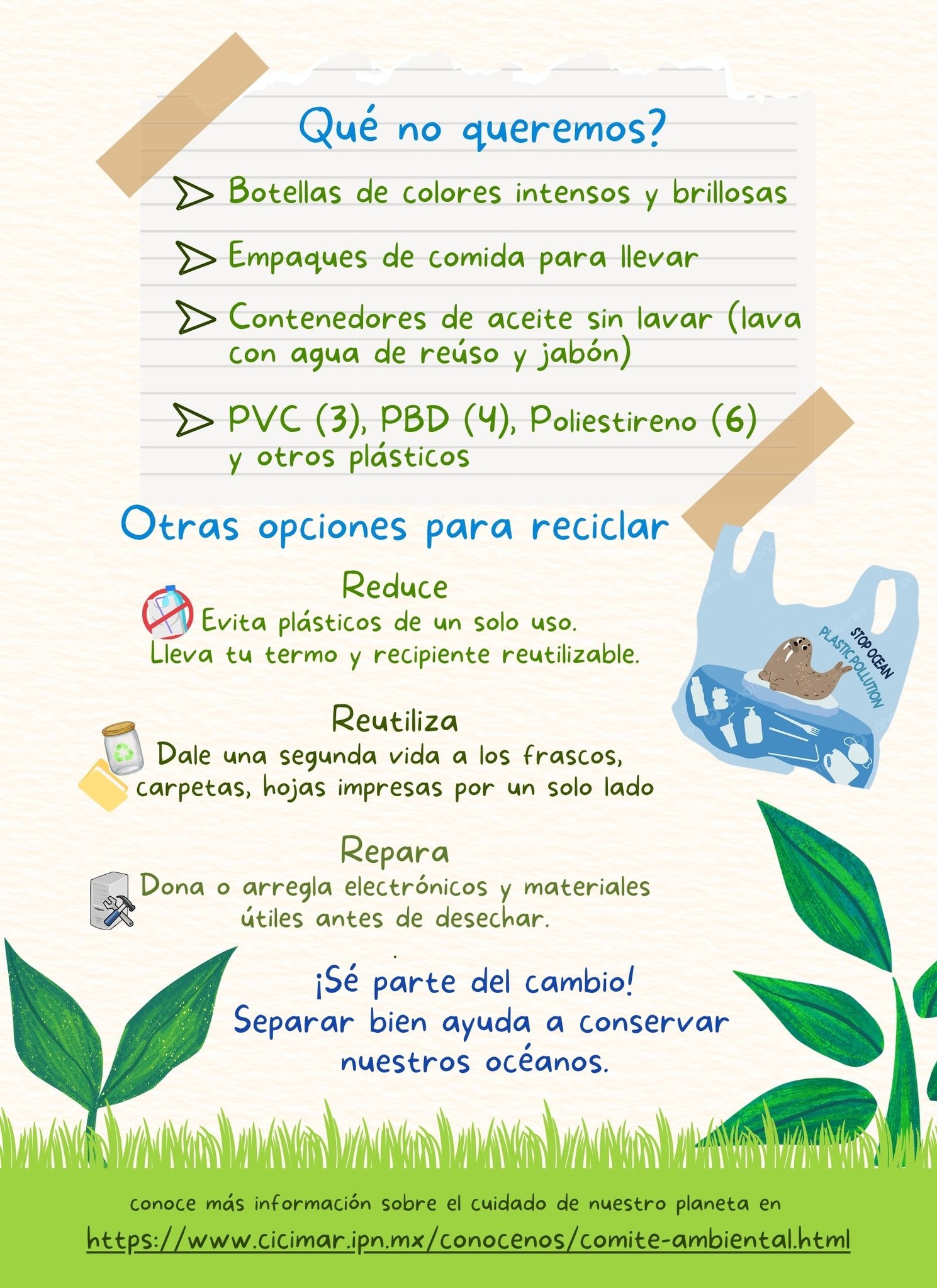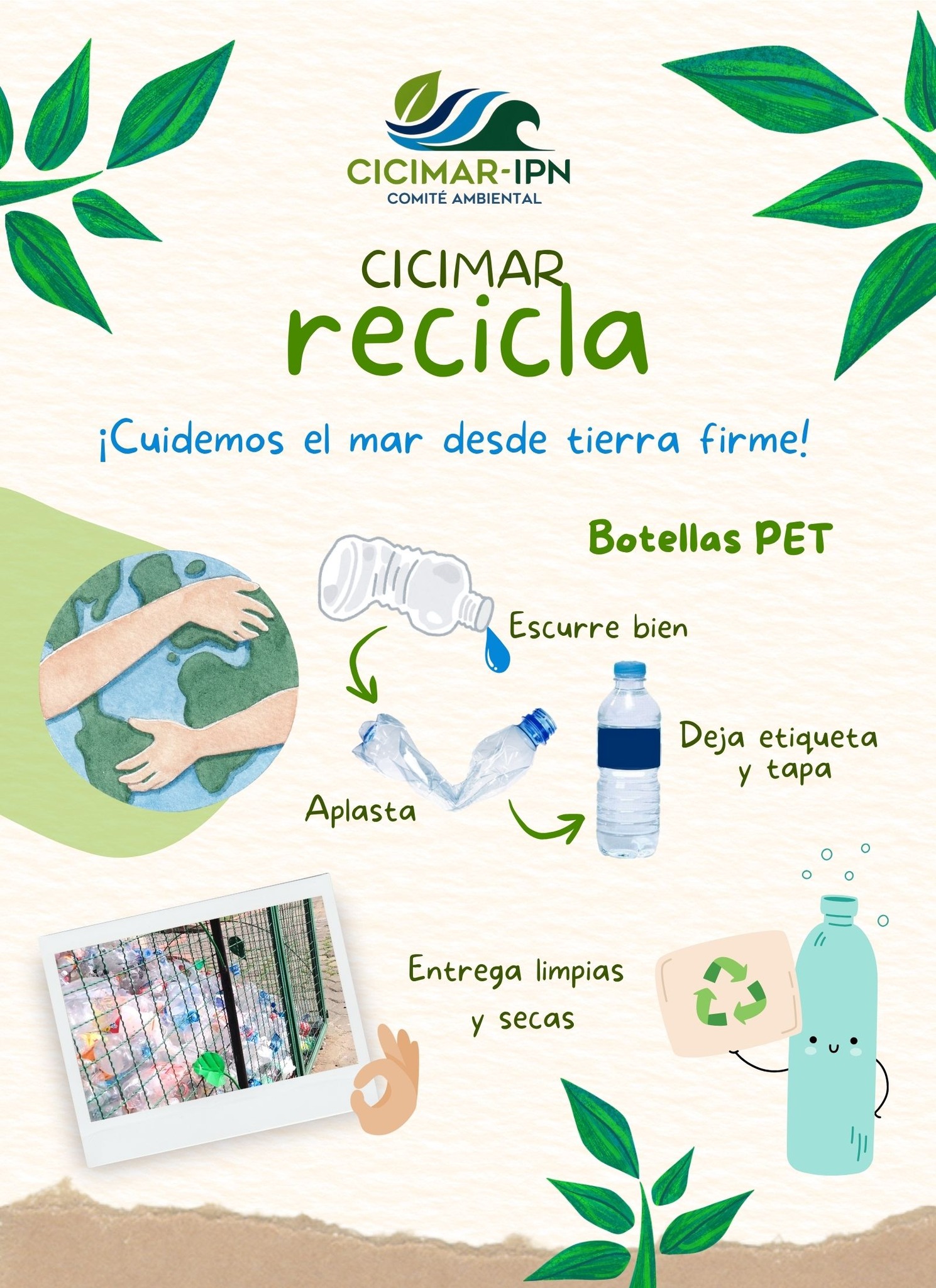 En el marco de la gestión sustentable de los Residuos Sólidos Urbanos en el CICIMAR, el Comité Ambiental institucional invita a su comunidad a ser parte del cambio colaborando en la campaña permanente de recolección de residuos de plástico PET. Trae tus botellas de agua, jugo y demás envases que generas durante tu actividad cotidiana y deposítalos en los contenedores disponibles en distintos puntos de nuestro Centro.